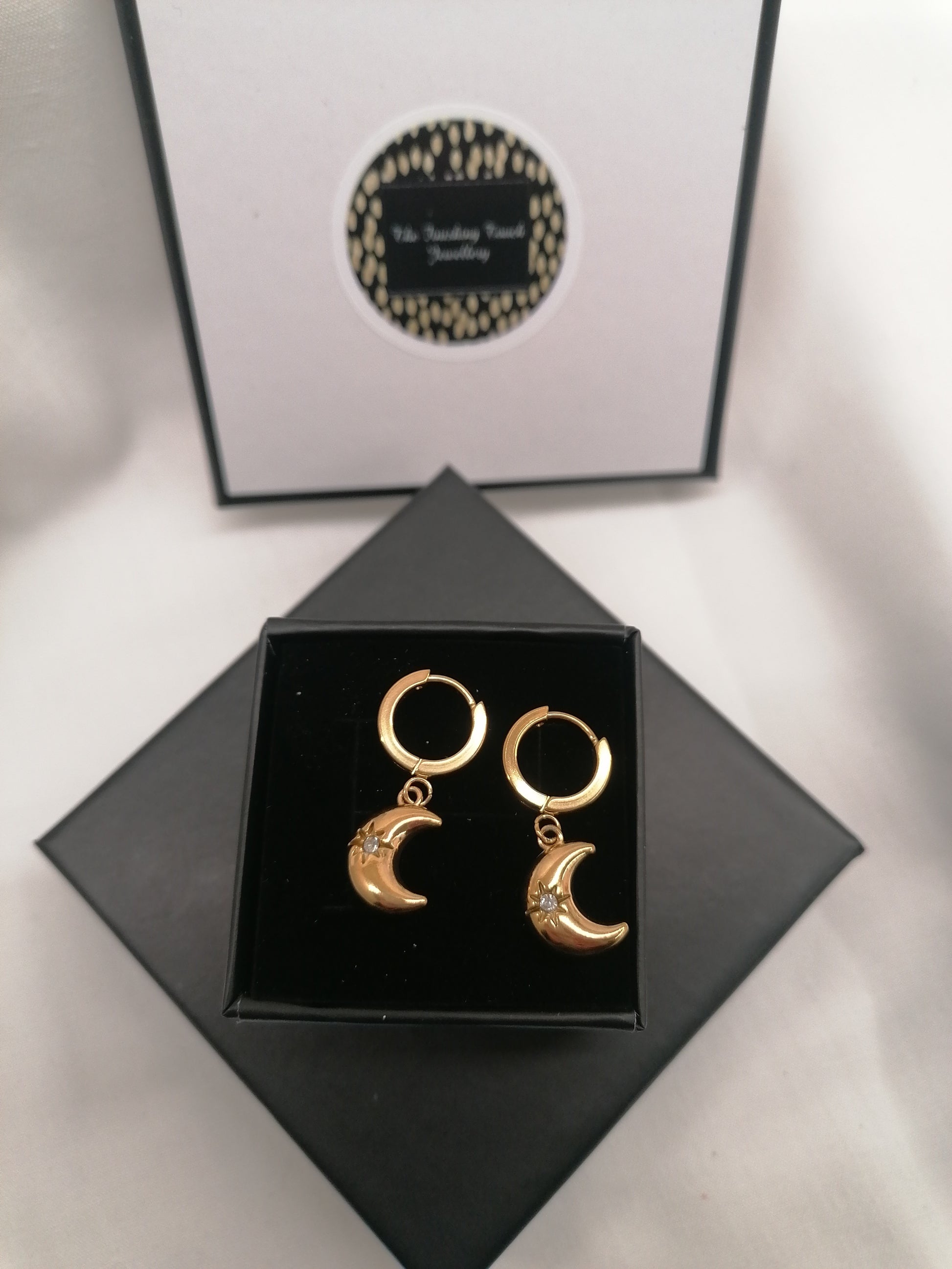 Elevate your everyday style with our Celestial Charm Collection — a trio of timeless gold-toned stainless steel earrings designed to capture light, love, and the magic of the night sky.