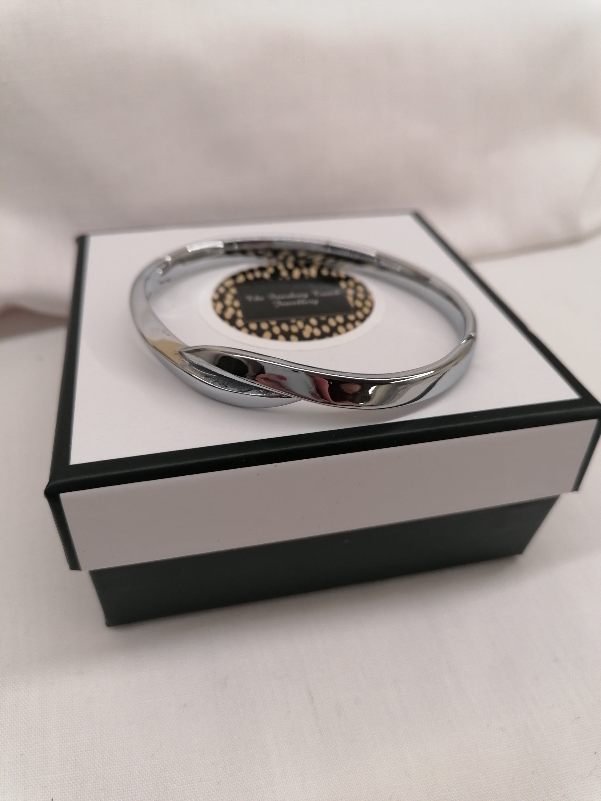 The sleek twisted design makes it a perfect statement on its own or layered with your favorite accessories. Whether you're dressing up for an evening out or adding polish to your everyday look, this bangle is a versatile must-have.