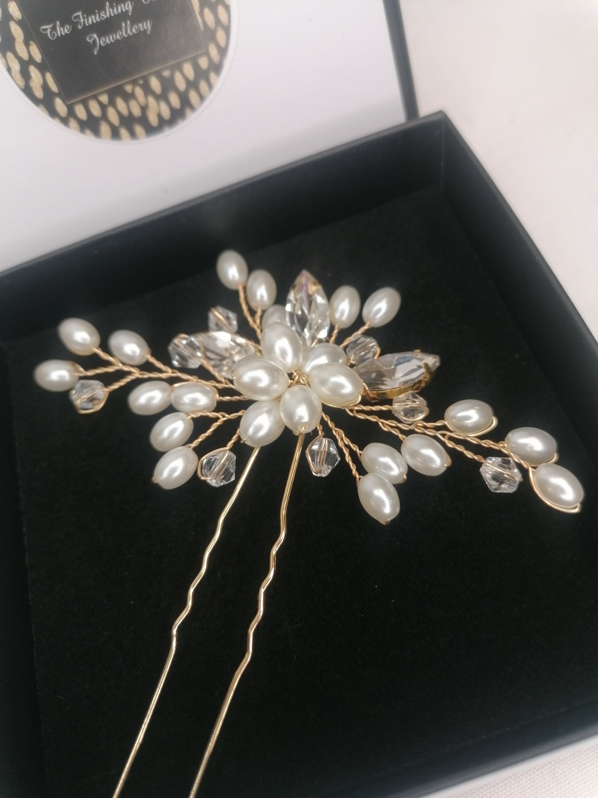 Beautiful hair pin made from pearls & clear crystals...